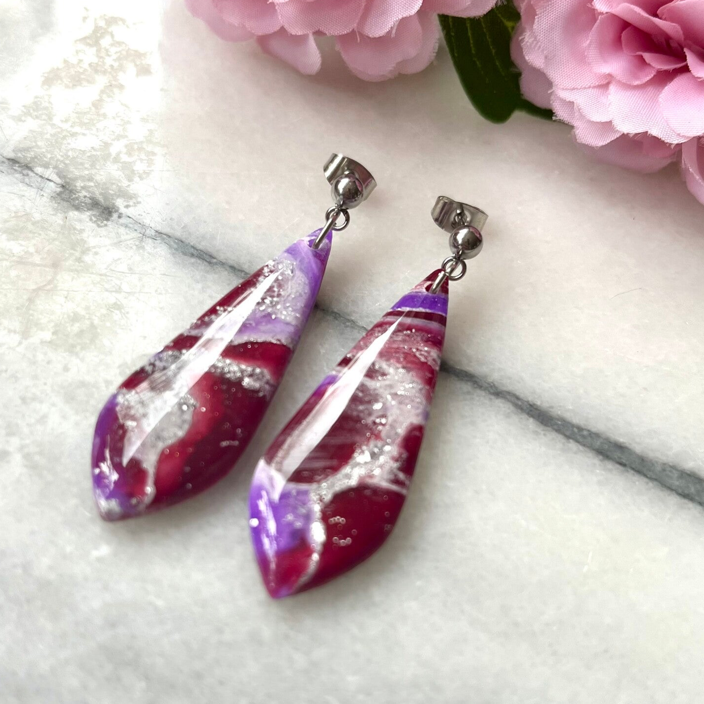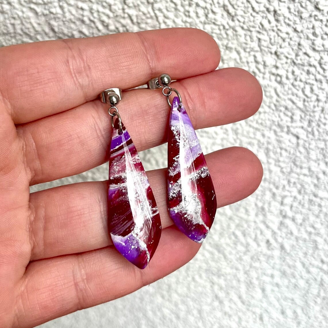 Materiaal: polymeer klei met hoge kwaliteit epoxy (resin) met stainless steel knopje. De achterkant van deze oorbellen heeft ook epoxy.